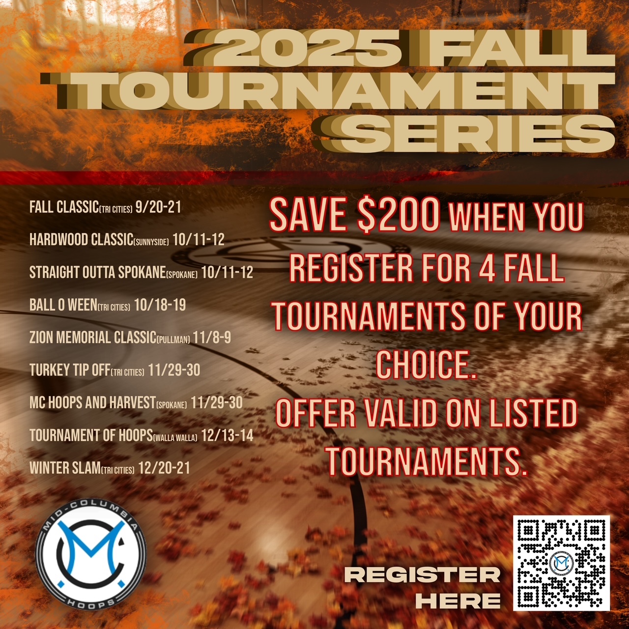 FALL TOURNAMENT SPECIAL: Save $200 when you register for FOUR Fall tournaments of your choice. Offer is valid on all Mid Columbia Hoops tournaments through the end of 2025.